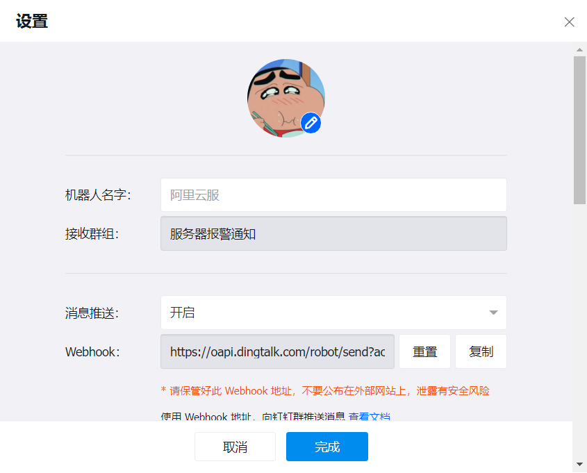 获取 Webhook 链接:完成机器人的创建与安全设置后,系统会生成一个 Webhook 链接。这个链接犹如一座桥梁,负责连接外部系统与钉钉机器人,用于接收和传输服务器资源告警信息。务必妥善保管该链接,防止泄露带来的安全风险。