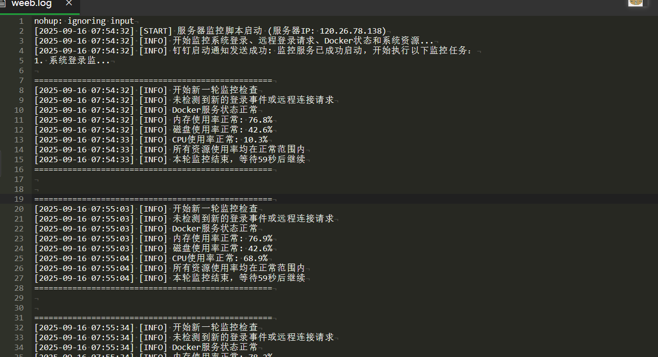 运行与监控:启动脚本后,密切监控服务器资源的状态以及钉钉机器人是否能够及时准确地发送告警信息。若发现异常情况,需立即停止脚本运行,并对代码和相关配置进行排查与修复。